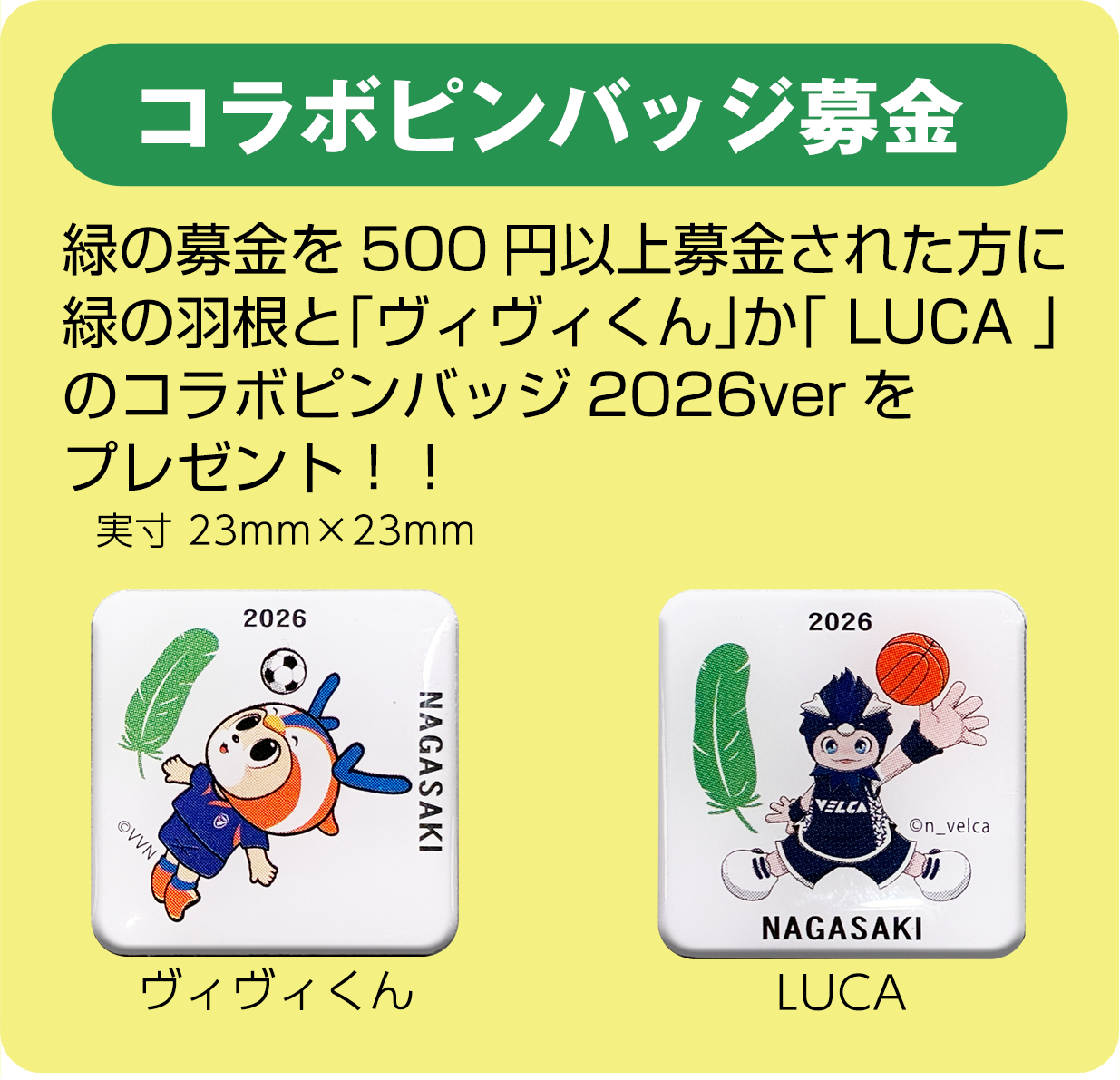 本協会では、今年もV・ファーレン長崎様並びに長崎ヴェルカ様のご協力により、クラブマスコットのヴィヴィくん、LUCAと緑の羽根のコラボピンバッジ2026verによる募金を開始します。緑の募金500円以上の寄付をいただいた方 …