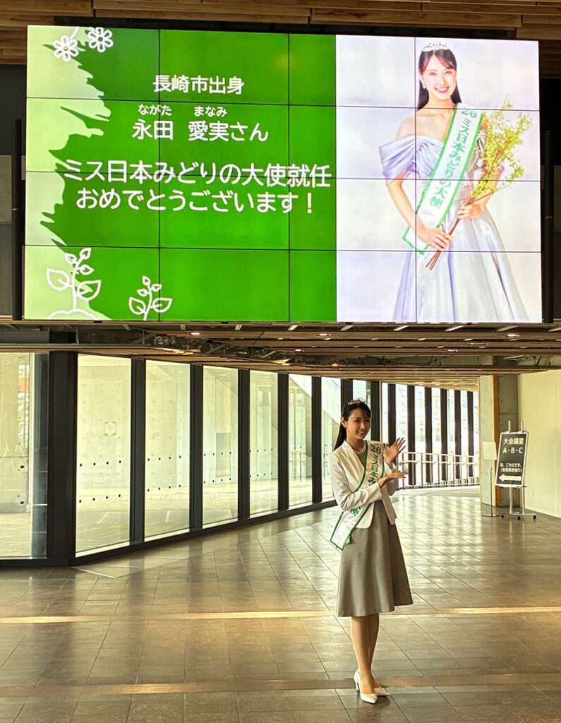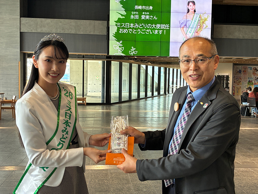 ミス日本2026「みどりの大使」に長崎市出身の永田愛実(まなみ)さんが選ばれ、2月14日(土)長崎市のランタンフェスティバルの皇帝パレードの皇后役として帰崎。それに先立ち、本協会にご挨拶に見えられました。永田愛実さんは高校生時代、高校野球イメージガールとして活躍。「声」を通して人と人の心をつなぐ伝え手になりたいということで、さっそく地元紙のインタビューにも「林業の魅力を伝えていきたい。長崎の良さも発信していきたい」と語っていました。ミス日本2026「みどりの大使」永田愛実さん、訪問ありがとうございました。