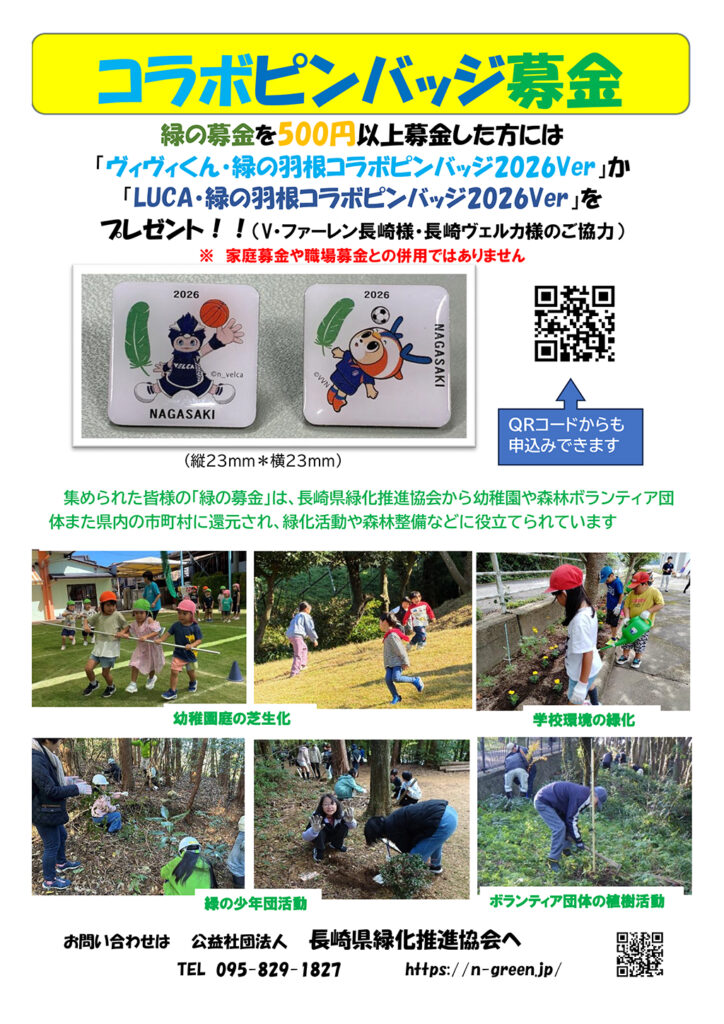 募金をいただいた方に花苗をプレゼントします。また、500円以上の募金の方には、V・ファーレン長崎のヴィヴィくん、長崎ヴェルカのLUCAと緑の羽根の2026Verコラボピンバッジどちらか1個を差し上げます。
